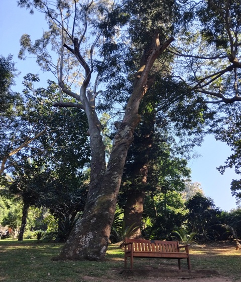 Here I am at a favorite bench under an eucalyptus teriticornis – forest red gum from Queensland, Australia.